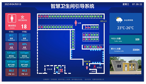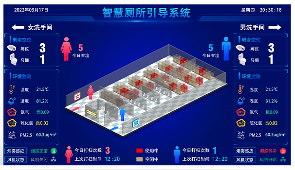 首先从技术层面来看,当前的智慧厕所建设引入了信息通讯、物联网、互联网等技术,并利用现代智能控制、传感传导等技术,搭建景区智慧厕所解决方案,对厕所内空间平面图、厕位现状、实时温度、湿度、空气质量等大数据显示专用智能显示屏上,引导群众有序进入如厕。