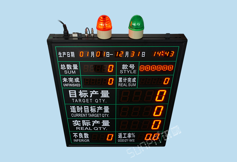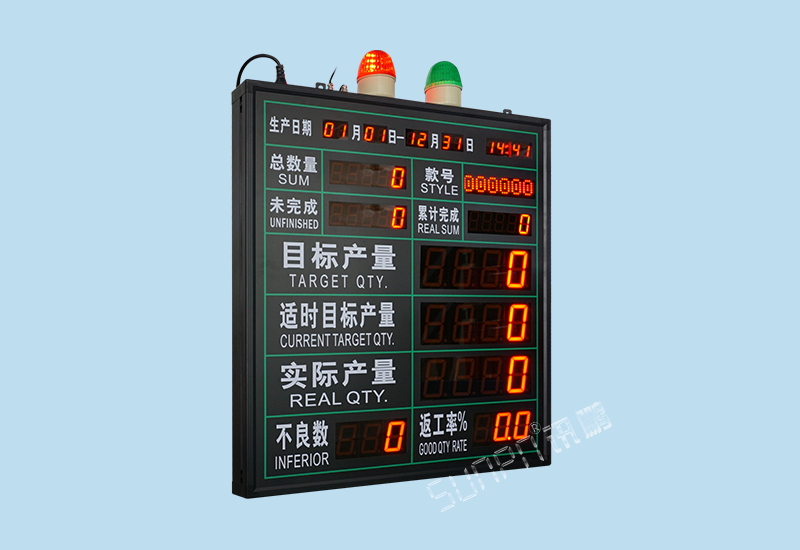单机版LED生产管理看板是最简单的一种生产管理工具,他只由工位触发硬件(计数按钮盒、光电开关、PLC等)、显示看板(点阵看板、数码管看板)组成。只作为单条产线数据采集的目视化管理。